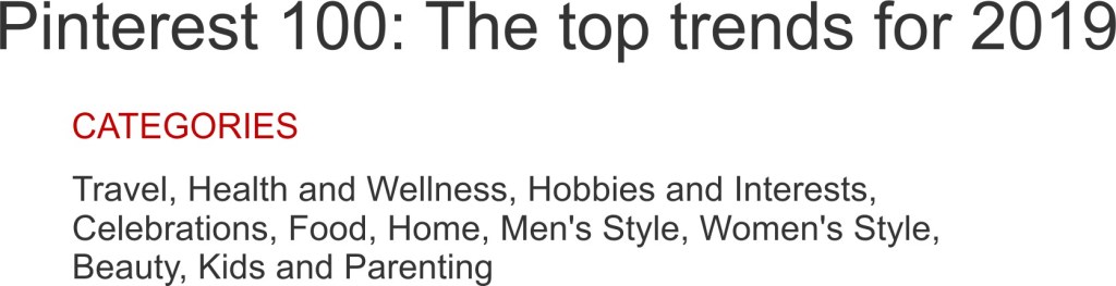 The impetus for me writing this particular article is that we are currently looking to promote our blog, Brand Building for Small Business, on Pinterest. Since we’re not a sure-thing kind of fit for this outlet, I went looking to confirm my personal impression that DIY business topics do perform well. Pinterest’s top 100 trends for 2019 fall into ten categories:
