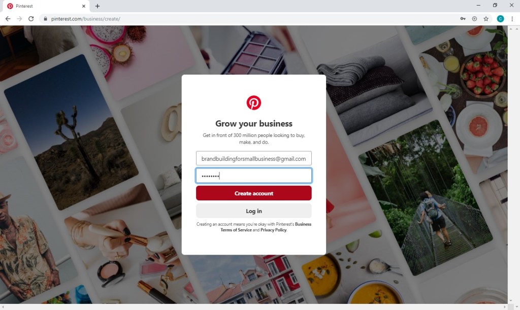 You can either add your business profile to your personal one (by clicking in the top right corner, then “Add a free business profile,” and completing the following prompts) or you can create a profile independent of your personal account (log out of your personal account, go to pinterest.com/business/create/, fill in your email and password, click “Create account,” and answer the questions that follow).