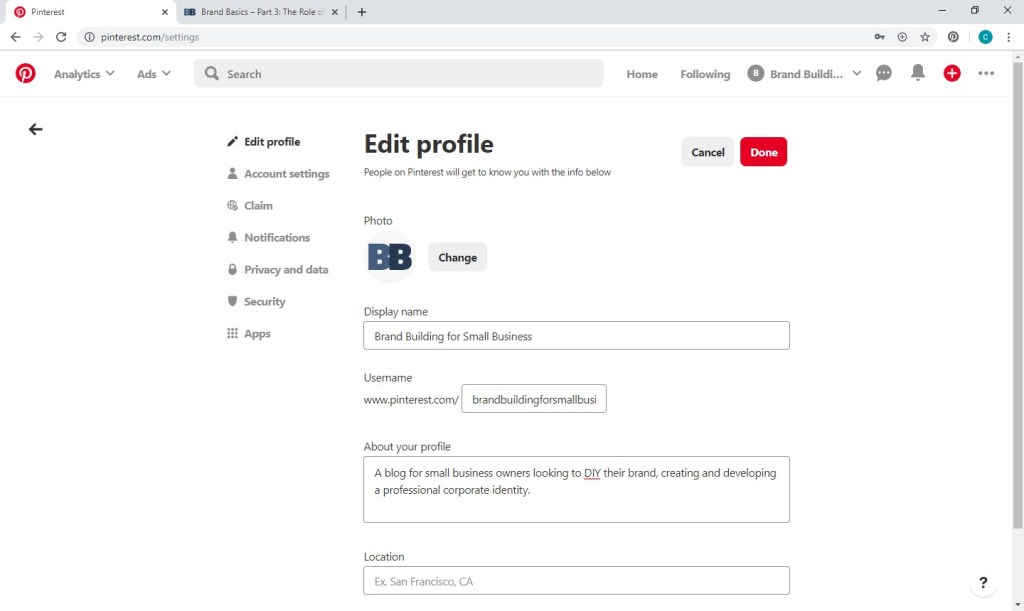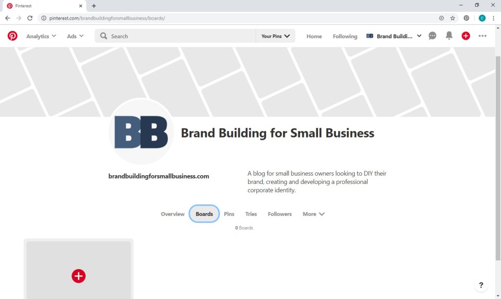 Next, you’ll want to decide how to structure your account. If you’re a photographer, you might want to have boards for each type of photography you do (weddings, babies, etc.). If you own a salon, you could create a board for each type of service you provide. As a blog for small business branding, I’m going to create a board for each brand component we focus on (logo design, style guides, direct mail, etc.).