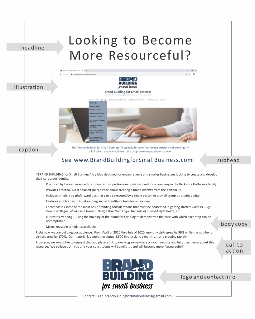 As the typical small business owner, you will often be the party wearing all of those hats! Therefore, you may be comforted to know that most ad designs encompass a handful of typical elements, which – when known – will be helpful in creating your ad copy and deciding upon the ways in which these elements interact . . . and perhaps even enable you to determine the ones that must be eliminated on a specific occasion for a particular reason.