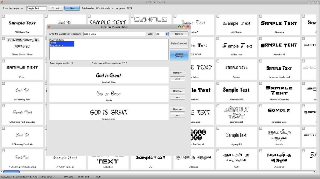 CPS Font Viewer This program was my absolute favorite, checking all the essential boxes on my font viewer wish list, excepting the very important fact that my computer would freeze for about a minute every time I interacted with the program, which is designed for a 32-bit version of Windows. (I’m guessing this is an important fact.) Frustration prompted my uninstalling the program before even taking a screen shot for you, but I was able to grab one from the software provider: