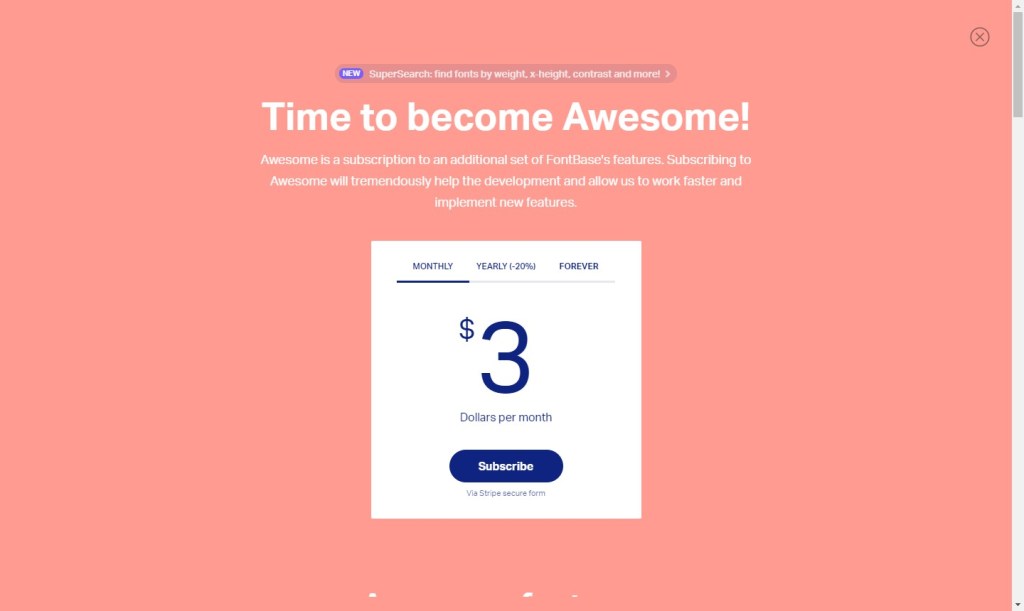 I initially really liked FontBase, performing the requisite job in a clean and modern interface. I also like that you can easily switch from your fonts to Google’s selection of 2,533 free fonts as desired. However, I really wanted to better utilize all that wasted screen space and increase the number of fonts I could peruse at a time. Unfortunately, the ability to switch from a row view to grid style, along with a number of additional options, requires an upgrade and at a pretty hefty price tag at that. Many seemingly functional buttons annoyingly transport you to this screen, where your options are $3/mo, $29/yr, or $180 forever.