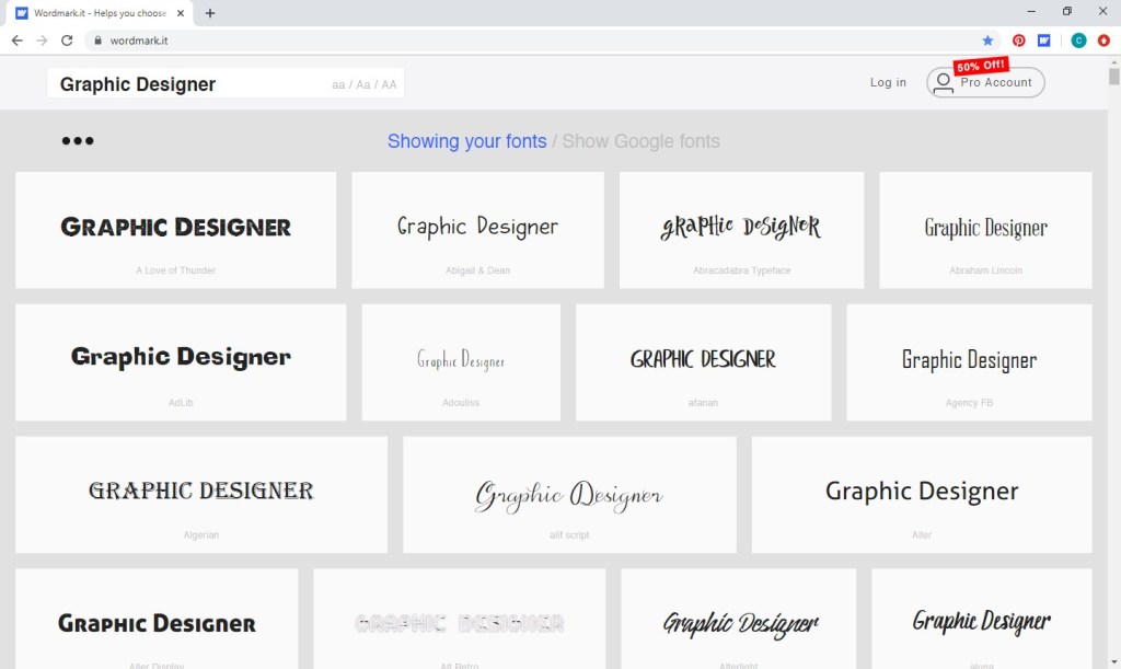Another modern and clean interface that can also easily switch from your installed fonts to google’s free fonts, this viewer is a big step up, providing a grid layout entirely free of charge. In fact, this is the only utility I sampled that is browser-based and didn’t need to be installed. Your only required payment comes in the form of one font block dedicated to an advertisement every other screen or so – a very reasonable price to pay in my book. However, this utility scans and previews your installed fonts using Adobe Flash Player, outdated software that Adobe has announced will no longer be supported as of December 2020. I noticed a bit of a lag on the web page itself and even more inconveniently in my other software while accessing Wordmark.it. (So going back and forth from discovering a possible font option on Wordmark.it to trying out the font in my project was not a smooth flow.) Hopefully, the company will find a more current way to make this utility available, because it’s pretty slick otherwise.