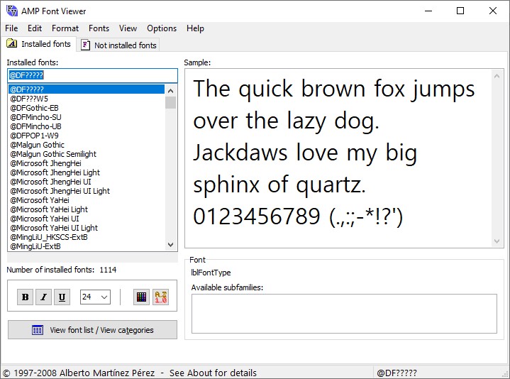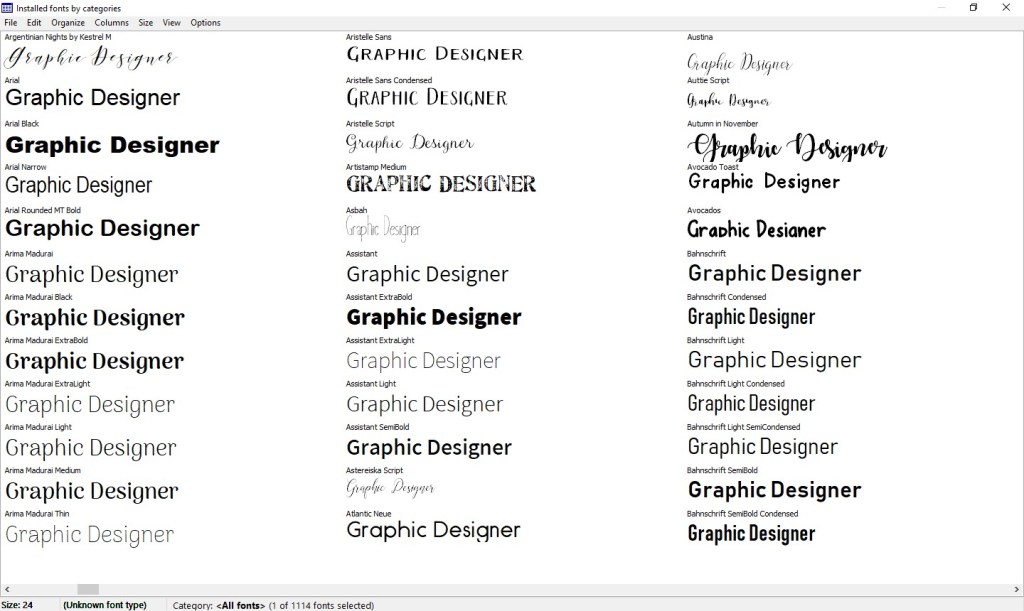 As a Christmas present to myself, I decided I would find a good utility for browsing my collection. When I am trying to decide on the perfect font for a project, this very common, teeny tiny, one-font-at-a-time preview is not nearly sufficient: